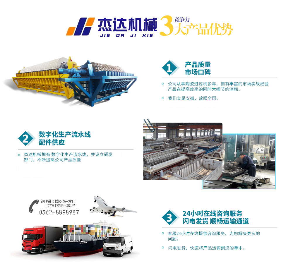 銅陵杰達機械設備有限公司坐落于中國古銅都-銅陵,是一家從事陶瓷過濾機,清洗系統技術研發,技術改造,生產、銷售、服務于一體的研發、加工、服務型企業。 公司自成立以來秉承以用戶需求為要點,在專注陶瓷過濾機技術研發的同時,企業還專設電氣控制部用以研發設計清洗系統。為陶瓷過濾機提供技術改造和技術支持。 用心的服務博得了眾多企業的信任和好評。在本行業內逐步樹立起公司良好品牌。企業產品、服務市場遼闊,銷售領域覆蓋全國,并遠銷新疆、西藏、青海、黑龍江、湖南,兩廣及云貴川等地。 公司不僅只提供的技術改造、技術支持,同時還成立了完善的售后服務體系,凡是我公司的客戶,我公司的售后將定期免費服務,為您的企業能及時的解決生產中的事故隱患提供指定協助。我們堅信,經過我們的不懈努力和追求,可以完成與您企業的互利共贏!